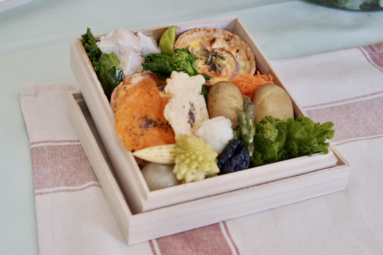 - キッシュカップにスモークサーモン、サバ、酢漬けにした紫玉ねぎを入れ、その上から卵液を流し込む。
